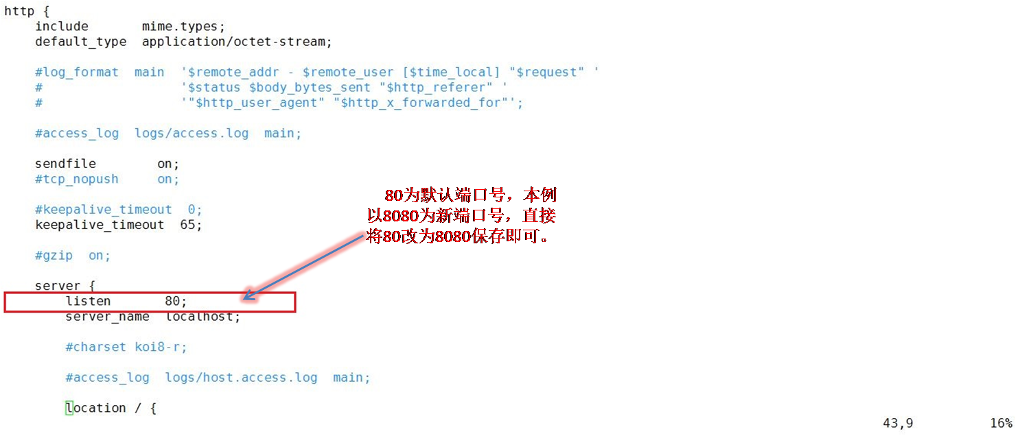 将80修改成其他端口本例中修改为8080,vim保存更改后文件。CentOS下执行如下生效。