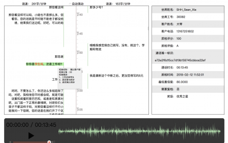 随着金融机构的业务发展呼叫中心的规模与日俱增,国内超过千席的呼叫中心不乏少数,呼叫中心语音数据体量巨大,是典型的非结构化“大数据”。由于语音通话数量巨大,人力成本日渐高涨,目前,大多数呼叫中心质检都是通过人工抽查的方式进行,该种质检方法效率低且缺乏统一的质检标准,在很大程度上制约了质检工作在量和质量的突破。